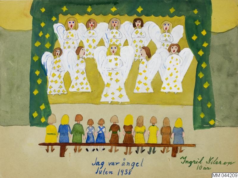 På framsidan skrivet med vattenfärg: Jag var ängel / Julen 1938 / Ingrid Nilsson / 10 år.