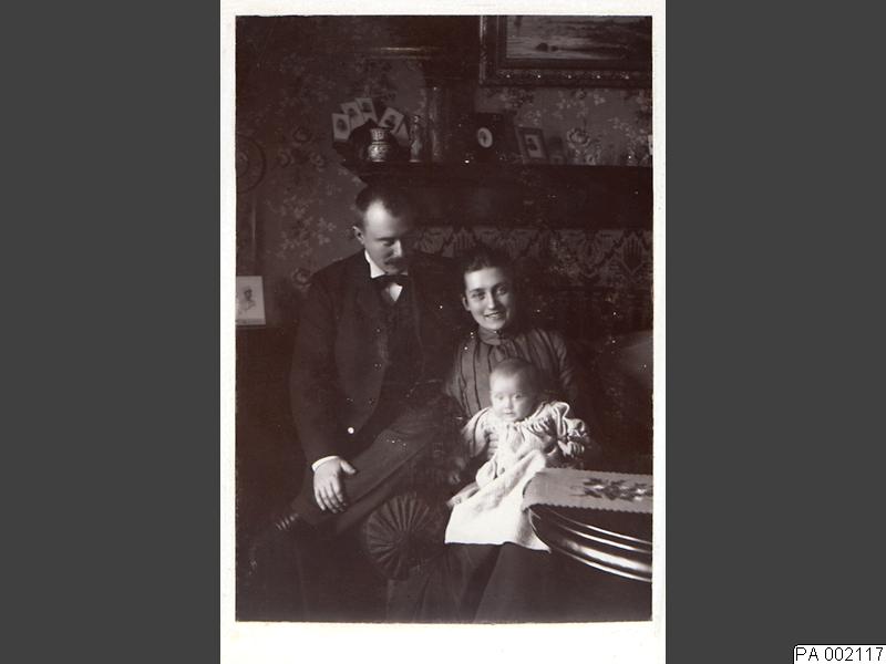 Visitkortsfotografi. Porträtt av hovrättsnotarie Johannes Liedholm, med frun Sofia, född Fogelklou, och sonen Rikard, sittande i rumsinteriör.