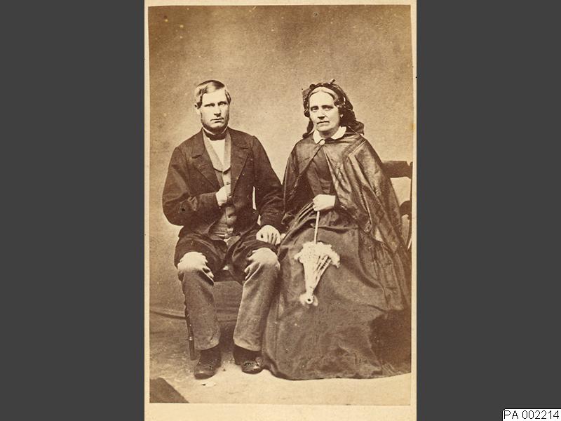 Visitkortsfotografi. Porträtt av klockaren i Vä, Carl Petersson med frun Carolina Elisabeth, född Espersson.