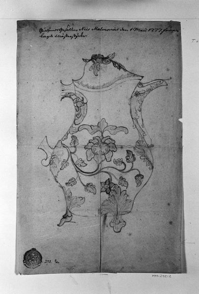 Mästareteckning, silverkanna, blyerts på papper, märkt: Guldsmeds Gesällen Nils Malmorius den 1 maii 1777 förelagde mästerstycke.