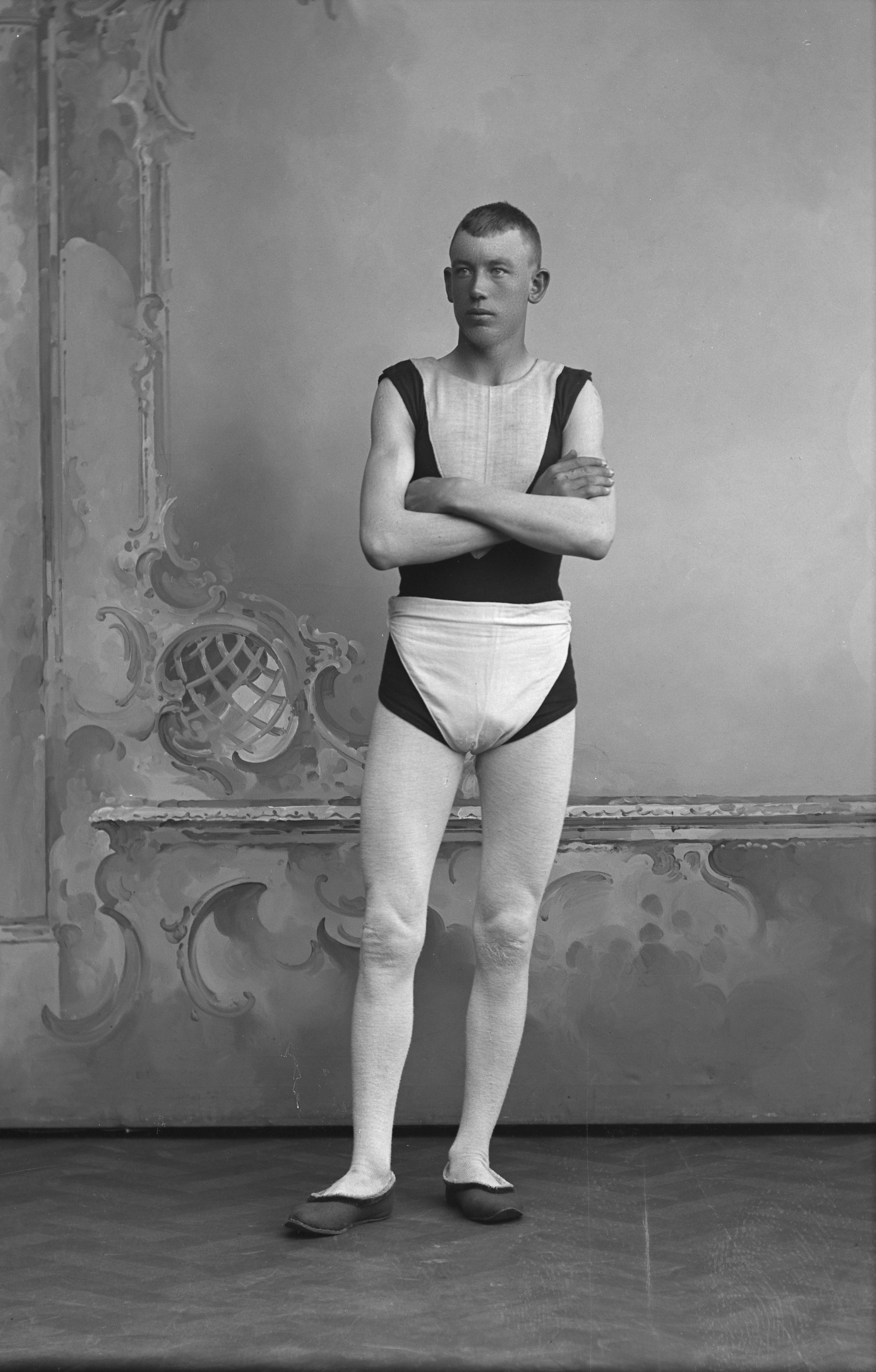 Porträtt i helfigur av Anders Månsson, iklädd dräkt, möjligen gymnastikdräkt.