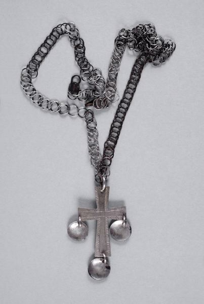 Hängsmycke, kors med tre nedhängande runda blad, graverad dekor; kedja.