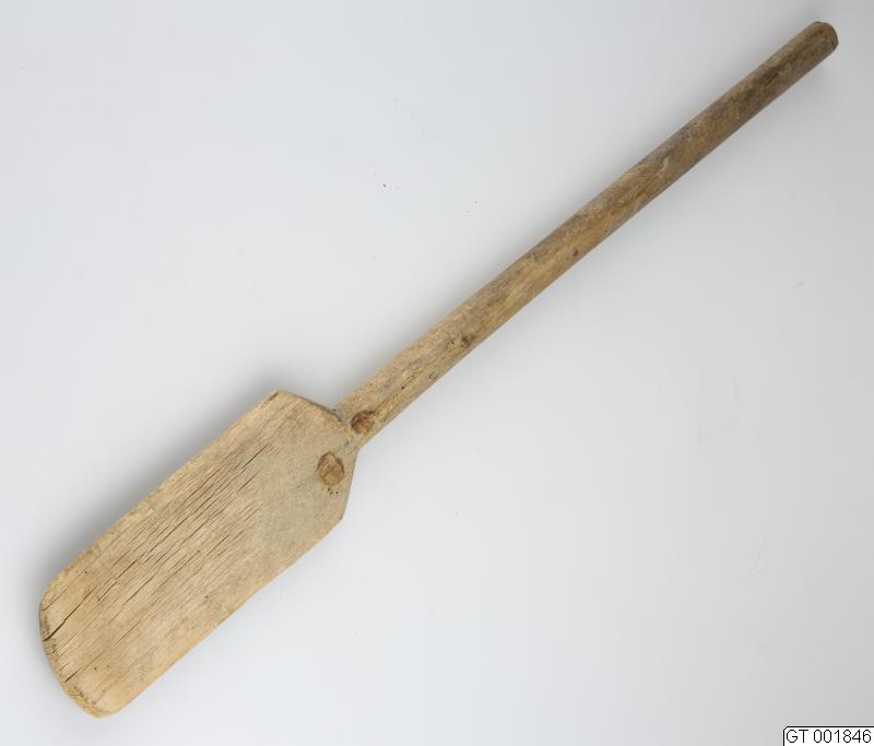 Långt, rakt klappeträ med runt skaft och rektangulärt, fasetterat blad