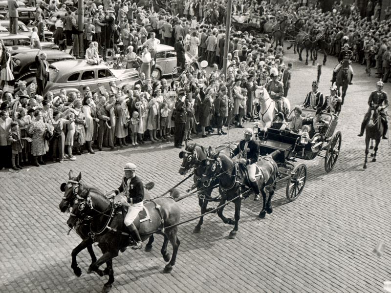 Kort. Fotografi. En kunglig kortege genom Stockholm med anledning av kung Gustav V:s 90-årsdag den 16 juni 1948.