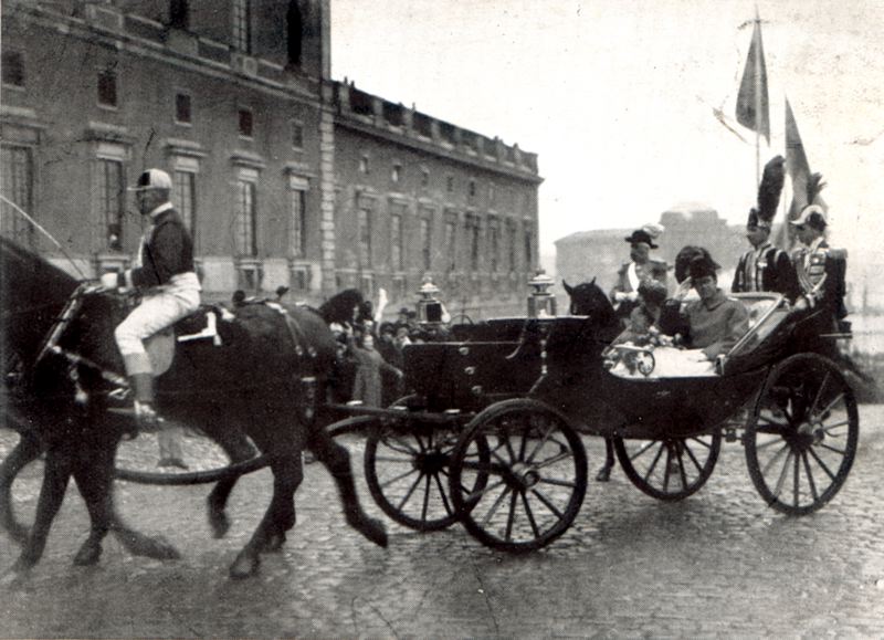 Kort. Fotografi. En öppen vagn med nygifta kronprinsen Gustaf Adolf och kronprinsessan Louise på väg in i Stockholms slott 1923.