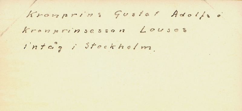 Text på baksidan: Kronprins Gustaf Adolfs och kronprinsessan Louises intåg i Stockholm.