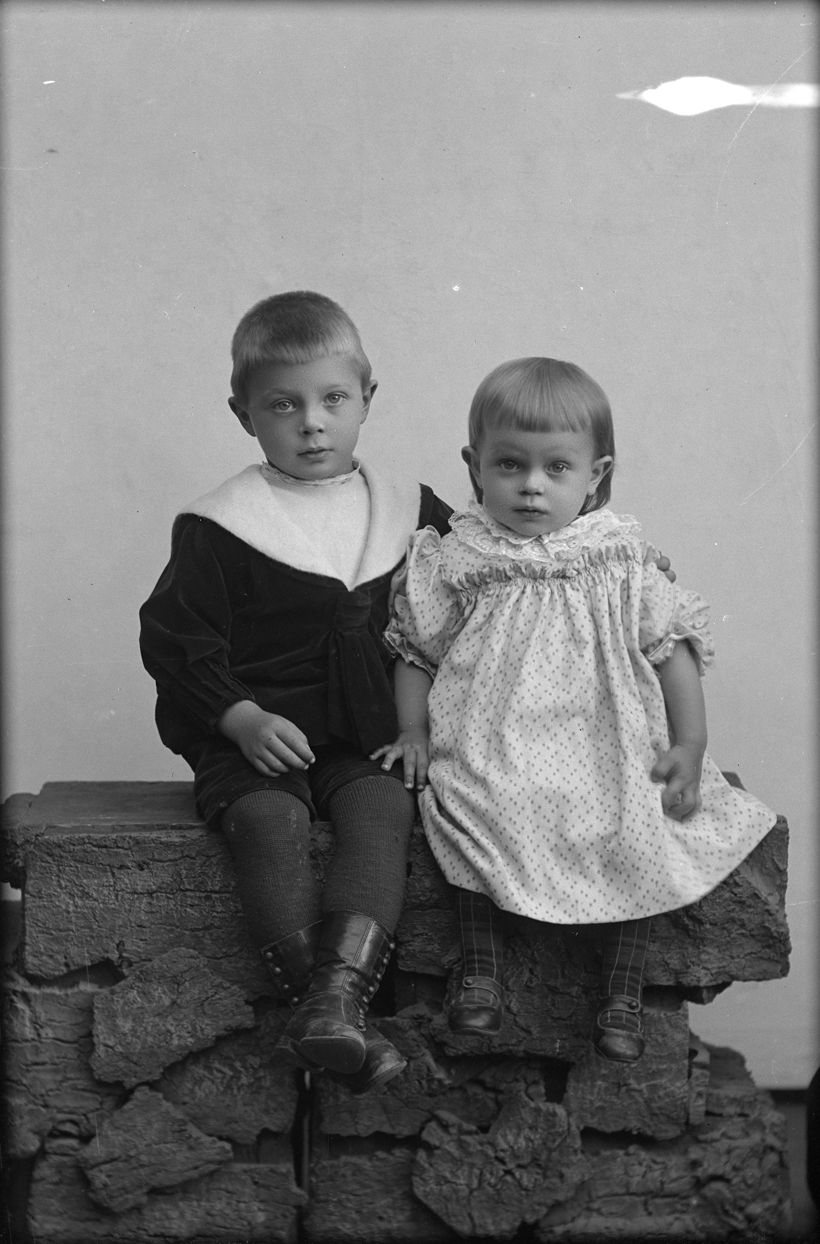 Porträtt i helfigur av Åbergs son och dotter, sittande på tegelmur. Sonen iklädd sjömanskostym.