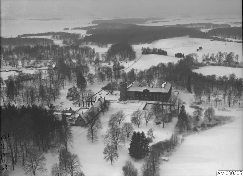 Sövdeborg. Flygfoto av O. Bladh. Byggnader och träd i snölandskap.