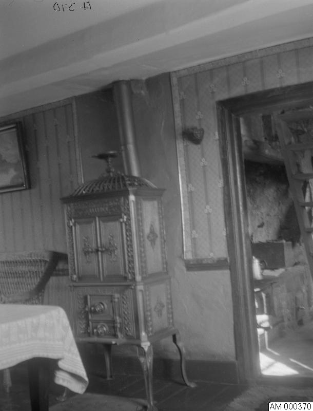 Inomhusbild som visar Norra Vram, Åsbo. Sofie Olssons stuga, interiör. En kakelugn, ett bord och mattor.