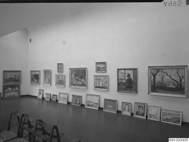 Inombild som visar utställningen Esther Gehlin: oljemålningar på Malmö museum. Tavlor och stolar. 1952.