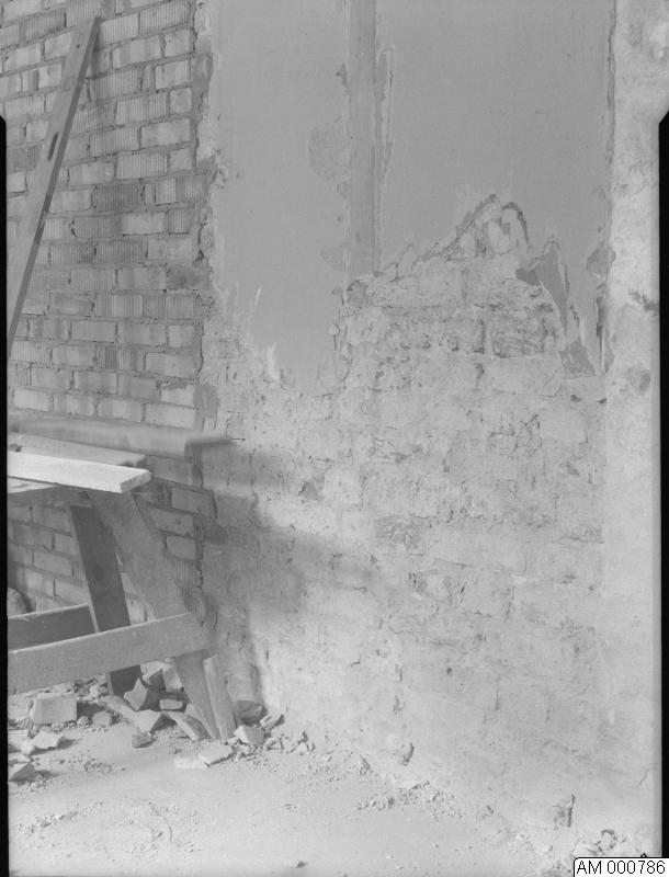 Inomhusbild som visar Kalendegatan. Rivningshus. Tegelvägg och en arbetsbänk.