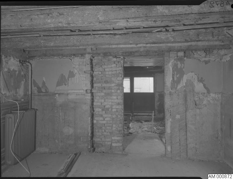 - Inomhusbild hörnhuset kvarter 48, Kalendegatan - Kompanigatan. Interiör av olika rum. Dörröppning och ett element. Kala väggar. 1953.