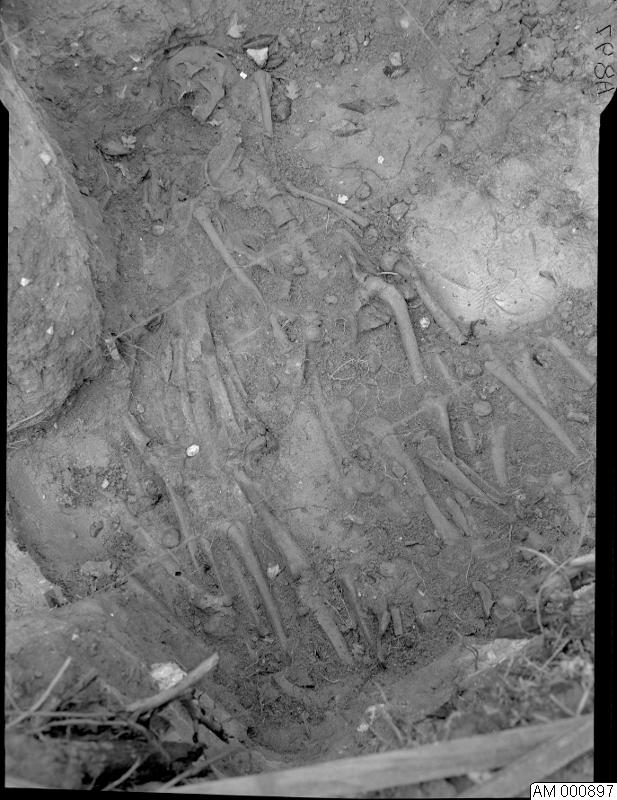 Utomhusbild som visar grävningsfoto, skelettdelar i marken, gravfynd.