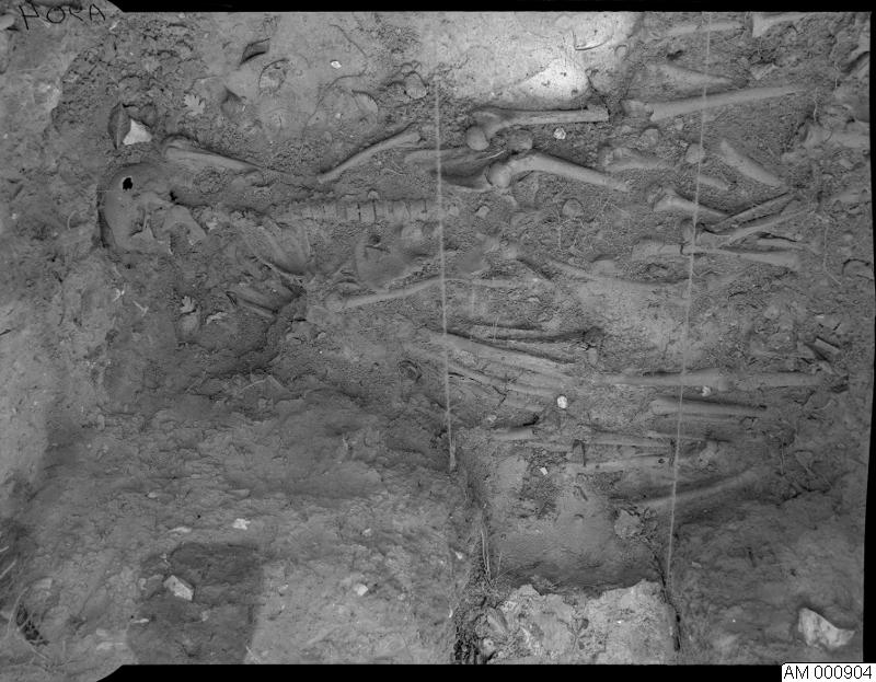 Utomhusbild som visar grävningsfoto, skelettdelar i marken, gravfynd.