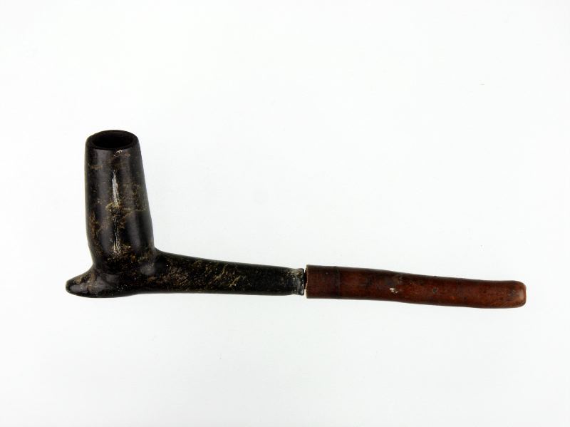 Tobakspipa av sten, svart och delvis gulbrun.