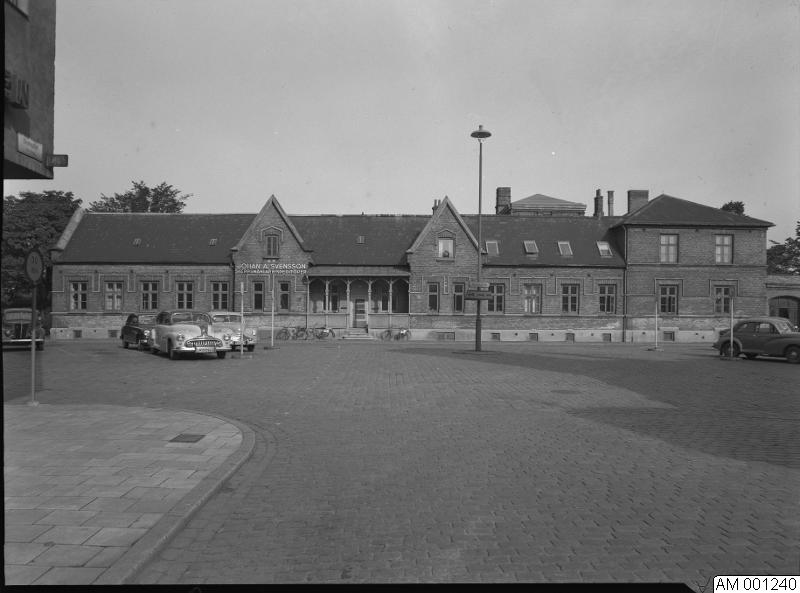 Utomhusbild som visar Malmö gamla badhuset. Johan A. Svensson AB. Skeppsmäklare speditörer. Bilar och cyklar står parkerade på gatan.