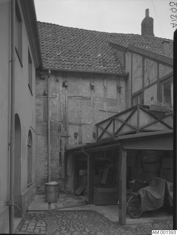 - Utomhusbild som visar Malmö kvarter 49 Oskar, Södergatan 7. Sydlängan från söder. Västra delen. Bostadshus, en bakgård med cyklar.