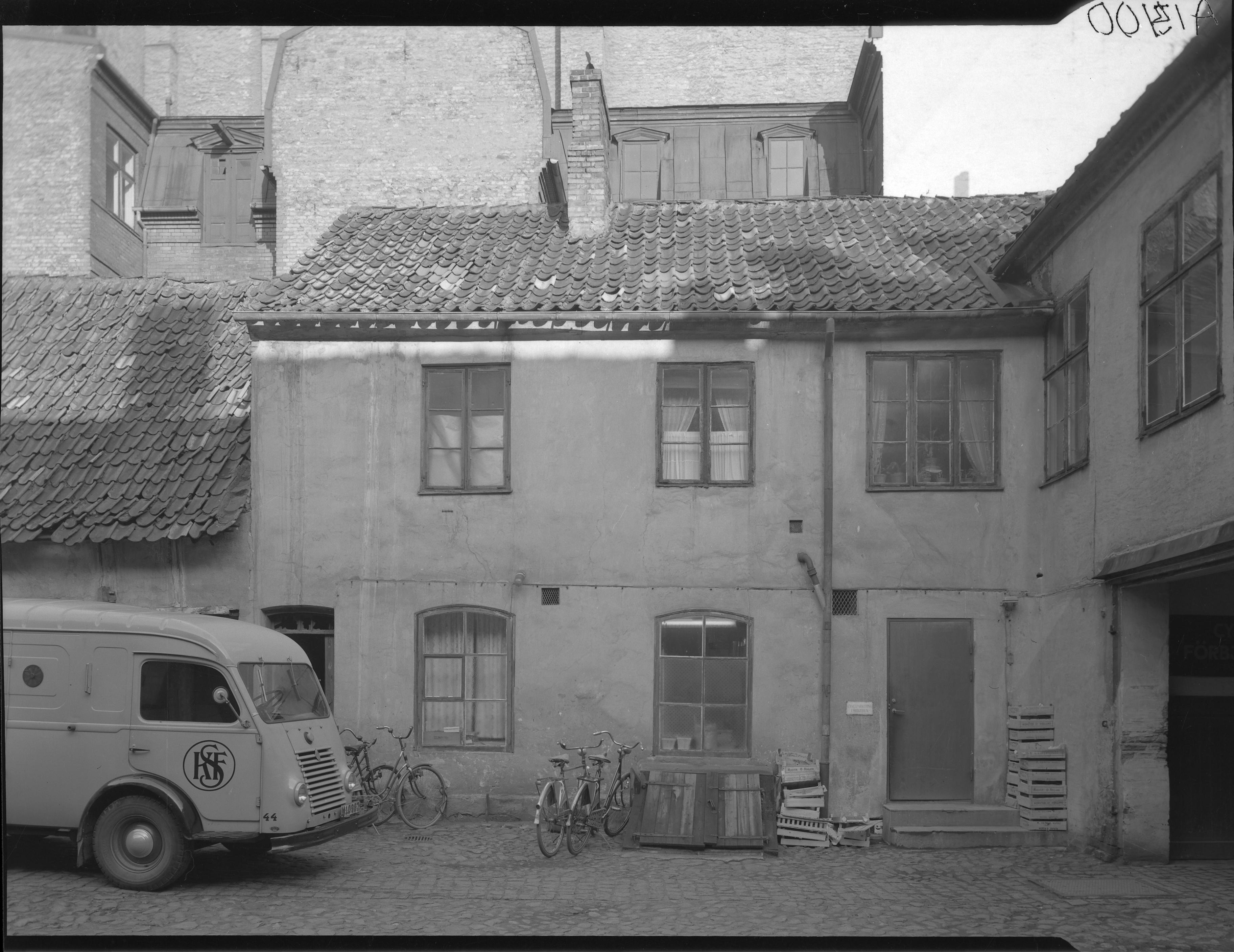 - Utomhusbild som visar Malmö, kvarter 49 Oskar, Södergatan 7. Nordlängans östra hus från söder. Bostadshus och en skåpbil samt cyklar parkerade på en innergård. 1954.