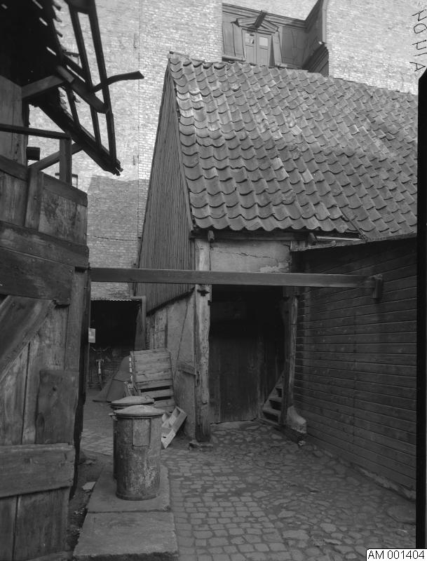 Utomhusbild som visar Malmö, kvarter 49 Oskar, Södergatan 7. Västra huset, västra gaveln. Bostadshus och soptunnor på en innergård.