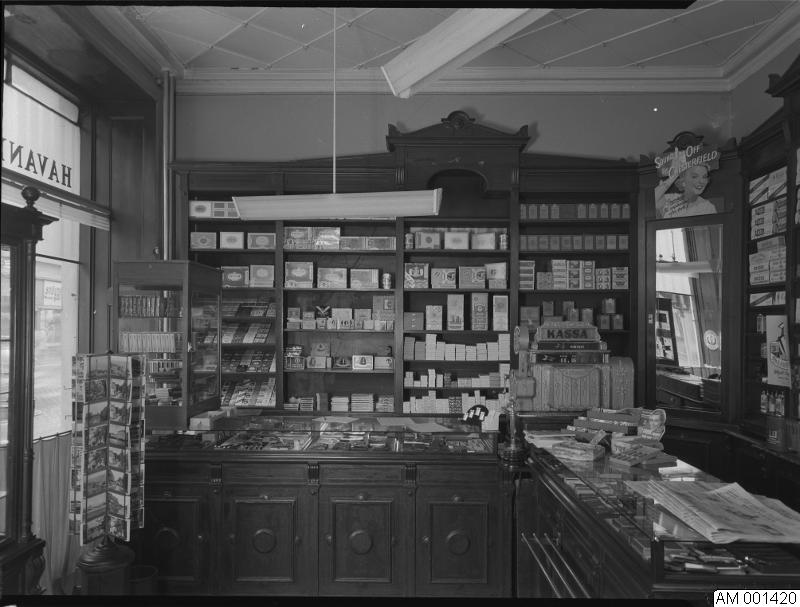 byggnader, hylla, hyllor, tobaksaffärer, cigarett, havannacigarett, tobak, affär, cigaretter, hus, byggnad, tobaksaffär, havannacigaretter, affärer, dagstidningar, vykortsställ, skyltfönster, spegel, disk, vitrinskåp