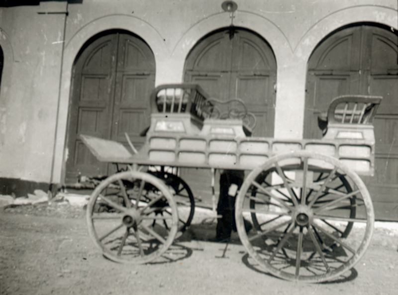 Kort. Fotografi. En öppen vagn, en jaktvagn, står på en gårdsplan framför ett hus med tre portar på en gård i Ryholm i Västergötland.
