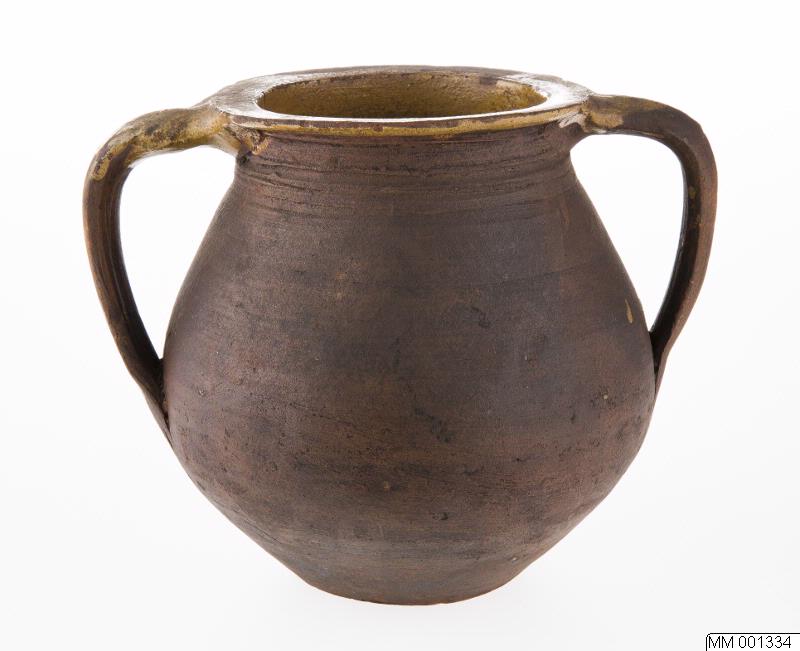 Kruka av lergods, öron, invändigt gulgrön glasyr.