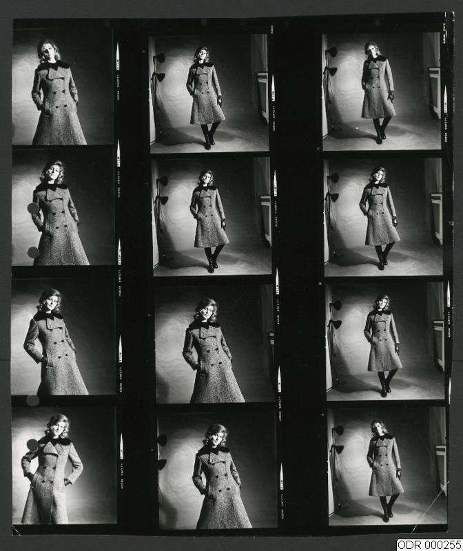 Modell i studio. Kvinna i kappa.