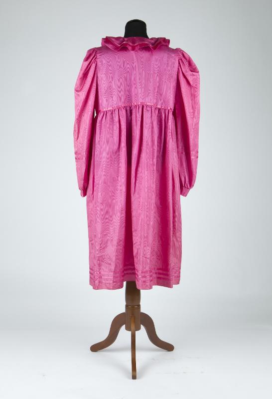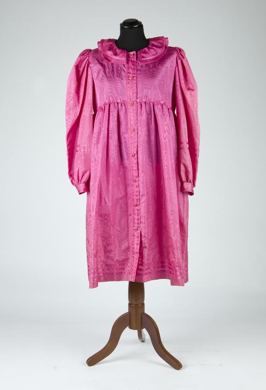 Lång klänning/kappa i cerisrosa konstsien i moaré. Avskuren under bysten med lätt rynkad nederdel.Helknäppt fram med knappslå och 8 ceriserosa plastknappar. Dubbel rundskuren krage. Lång ärm med manchett och plastknapp. Infällda sidofickor.