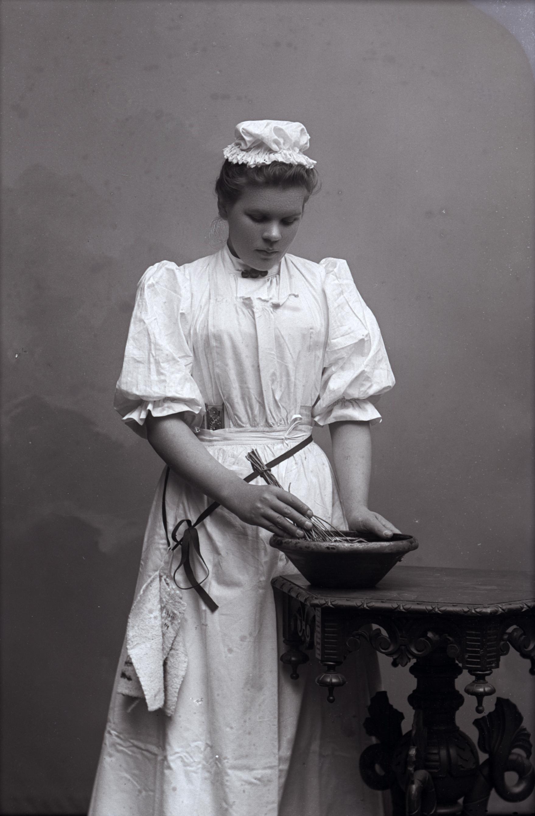 Porträtt i helfigur av pigan Elin Danielsson, stående vid bord, hållande visp och skål.