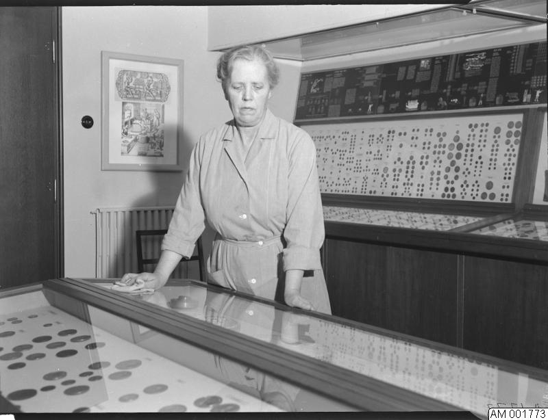 byggnader, rum, monter, kvinna, malmö museum, glasmonter, myntavdelningen, museum, anna liljekvist, glasmontrar, kvinnor, museer, mynt, städerska, städerskor, hus, montrar, byggnad