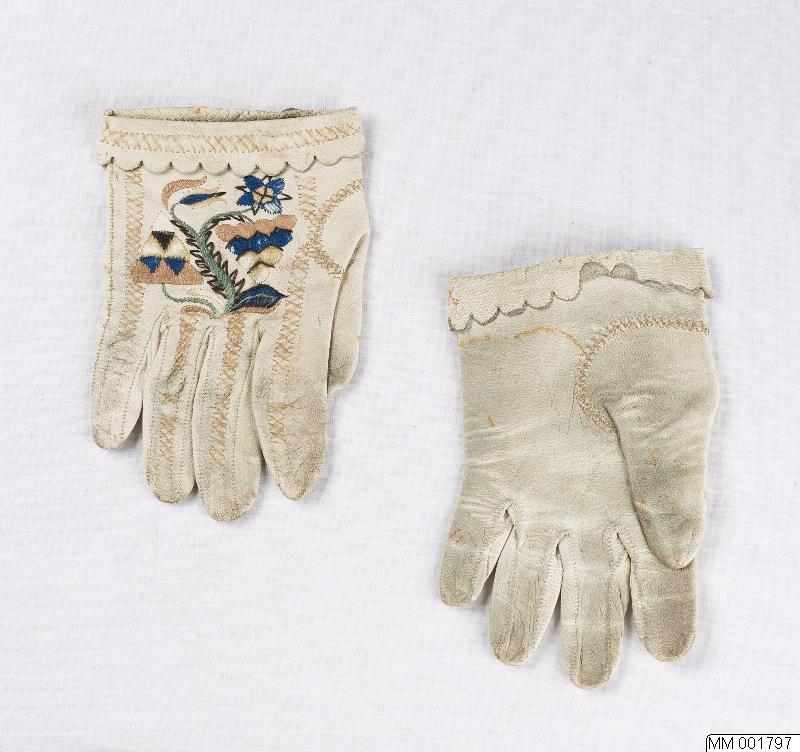 Ett par brudgummshandskar av vitt skinn med broderier i plattsöm och flätsöm av