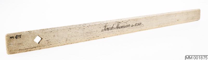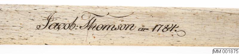 Linjal av narvalstand med ingraverad text: Jacob Thomson år 1784.