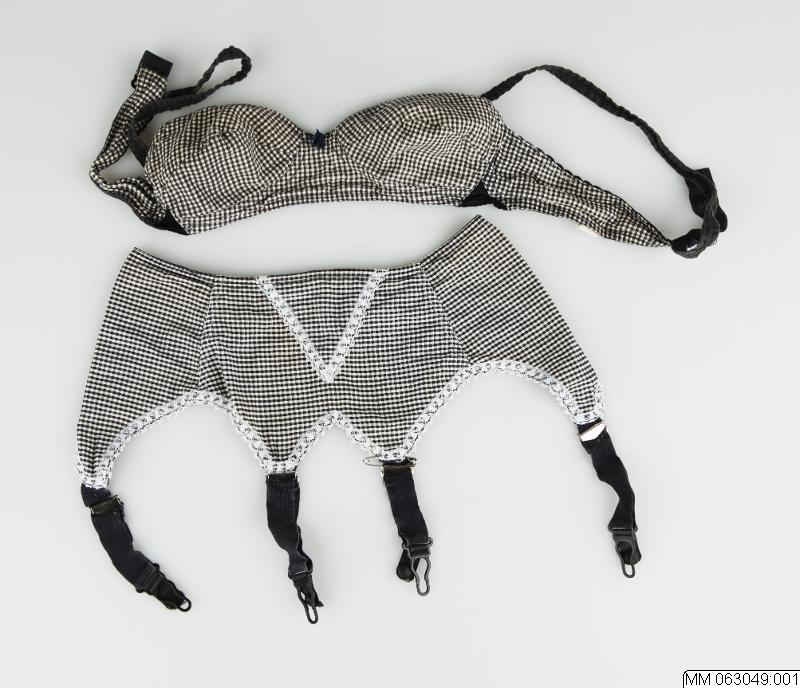 Höfthållare i smårutigt bomullstyg.Sydd av 3 delar. Knäppning med resårband och knäpphyska bak. Fyra strumphållare av resår med gummiknopp och metallöglor.