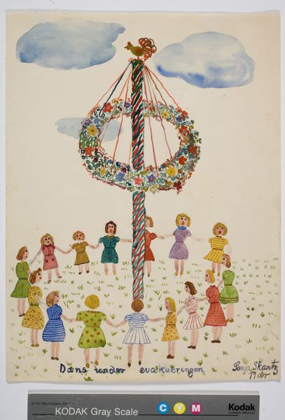 Barnteckning, akvarell föreställande ett antal flickor i ring kring en midsommarstång.