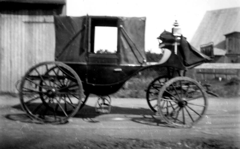 Kort. Fotografi. En fyrhjulig täckt vagn av landåtyp står på en gårdsplan till en bondgård vid Landskrona. Vagnen tillhör Nya Flyttningsaffären i Landskrona.
