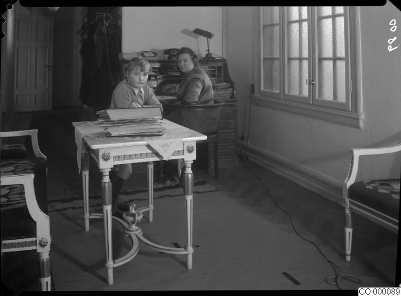 Arbetsrum eller kontorsinteriör med kvinna och pojke.