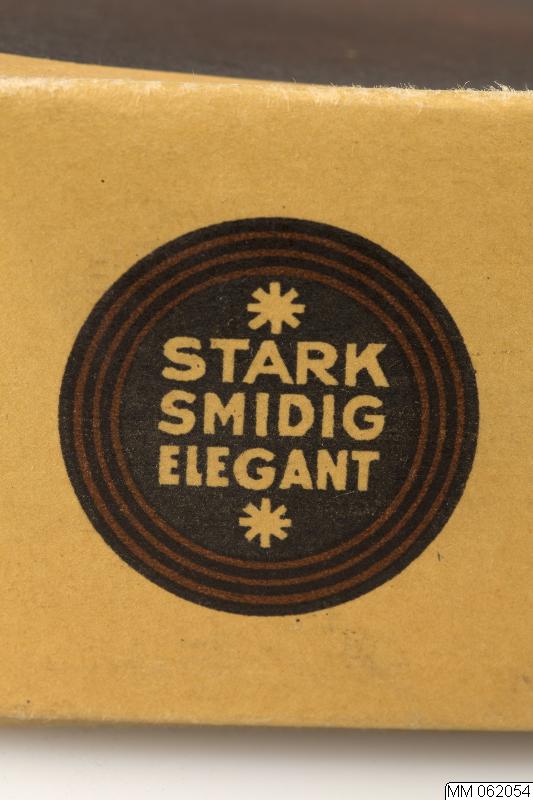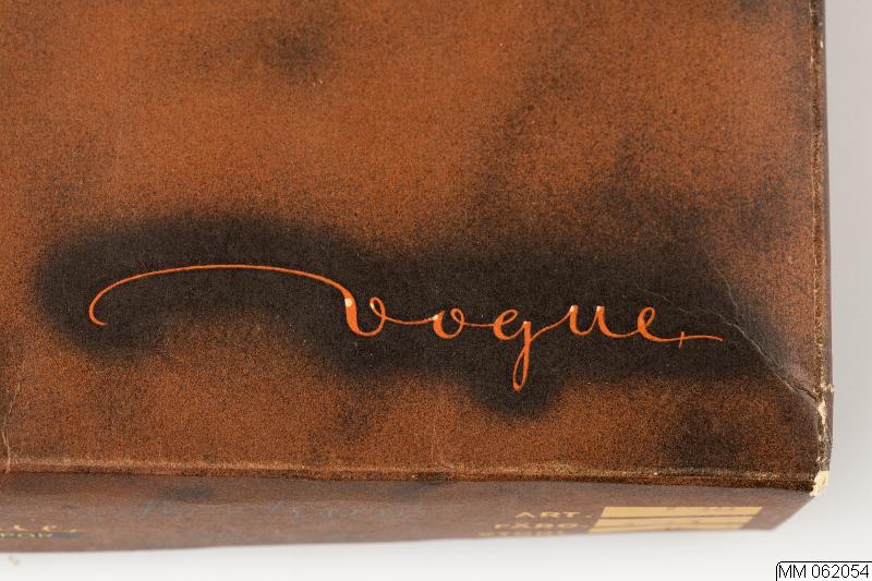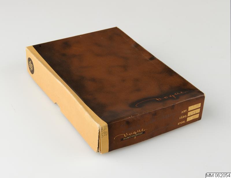 Ask av papp med brunfärgat lock för damstrumpor. På locket påtryck: vouge