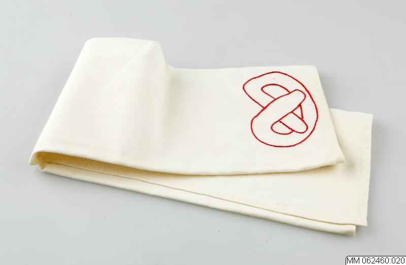 Bakduk av lakansväv, hanfållad och i ena änden en broderad kringa i rött bomullsgarn.