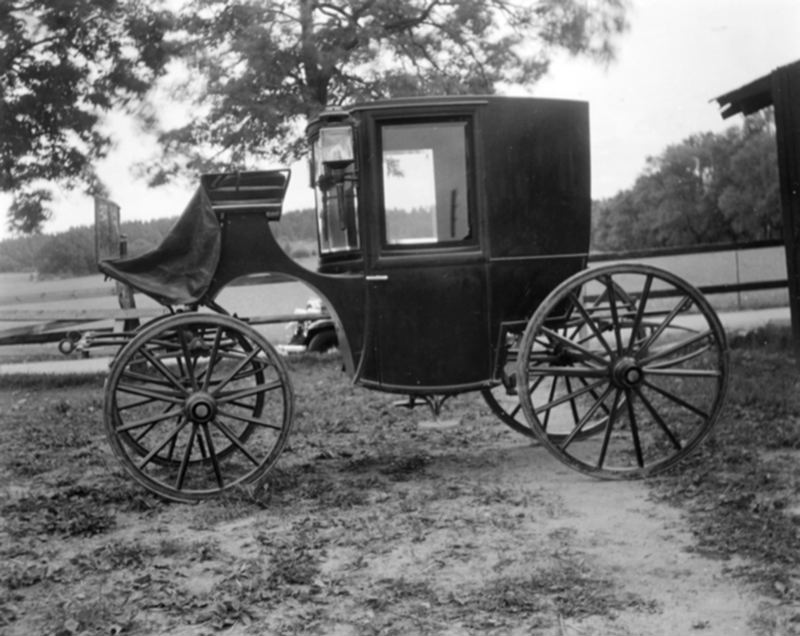Kort. Fotografi. En fyrhjulig täckt vagn av clarencetyp står på en äng invid en gård i Näs i Östergötland.. Vagnen är tillverkad av J.E. Norman i Stockholm.