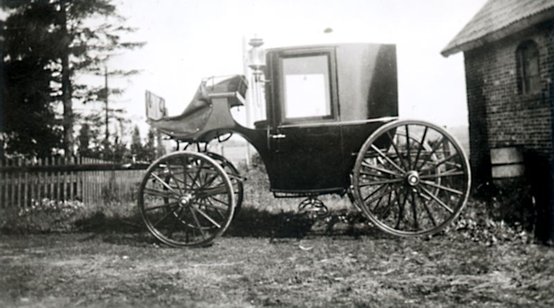 Kort. Fotografi. En fyrhjulig täckt vagn av clarencetyp står på en gårdsplan på Gustafsfälts gård. Vagnen är tillverkad av Schulz i Köpenhamn.