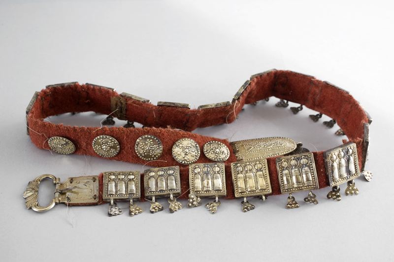 Rött vadmal med beslag av silver, förgyllt med pressad dekor. Spänne av