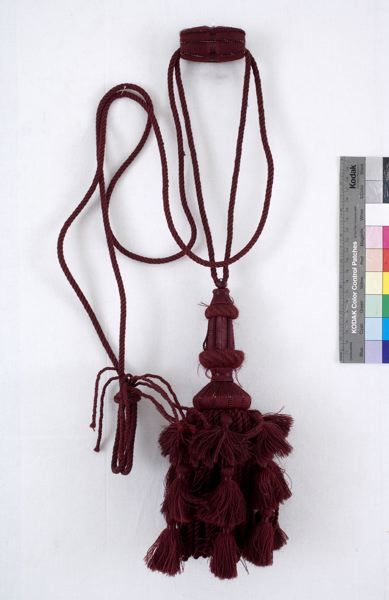 Ett spjällsnöre bestående av två hårt tvinnade mörkröda snören som i ena änden sitter ihop tillsammans med en rejäl mörkröd duska av drejade ullfransar och små ullgarnstofsar. Ovanför duskan sitter några olika träpärlor överklädda med både ull och silke.