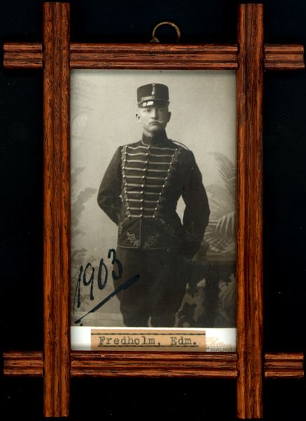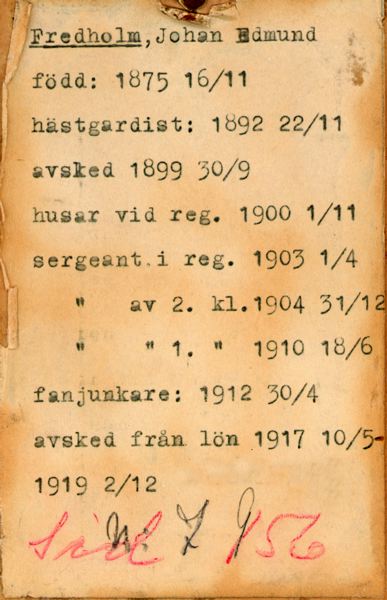 Maskinskriven text på baksidan: Fredholm, Johan Edmund, född 1875 16/11, hästgardist: 1892 22/11, avsked: 1899 30/9, husar vid reg. 1900 1/11, sergeant i reg. 1903 1/4, sergeant av 2. kl. 1904 31/12, sergeant av 1. kl. 1910 18/6, fanjunkare 1912 30/4, avsked från lön 1917 10/5 - 1919 2/12.