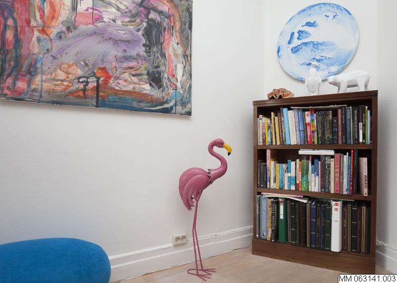 Flamingo i stål placerad i vardagsrummet hemma hos Stine Berger. Flamingon är köpt på Lidl.