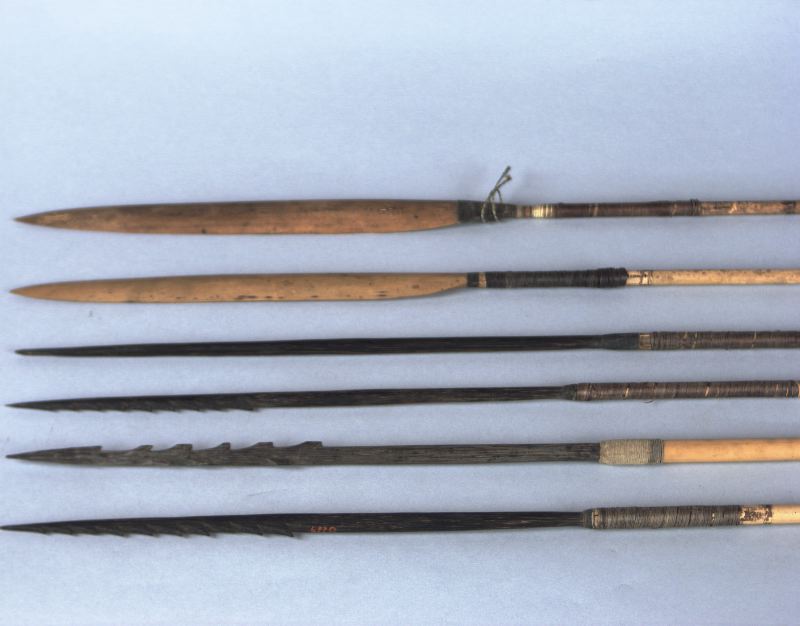 Sex stycken pilar med brungula skat utan fjädrar, tre av spetsarna är
