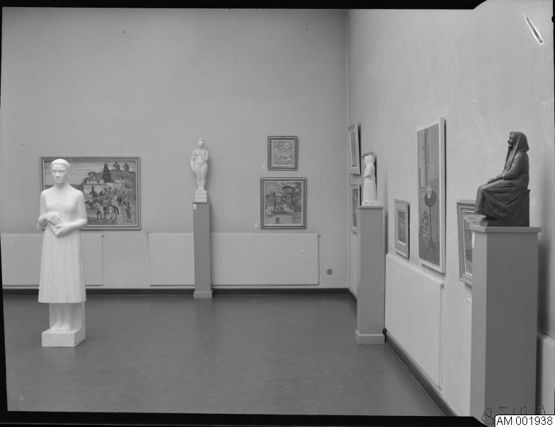 Inomhusbild. Malmö museum tillfällig utställning augusti 1955. Konstavdelningen. Tavlor och statyer.