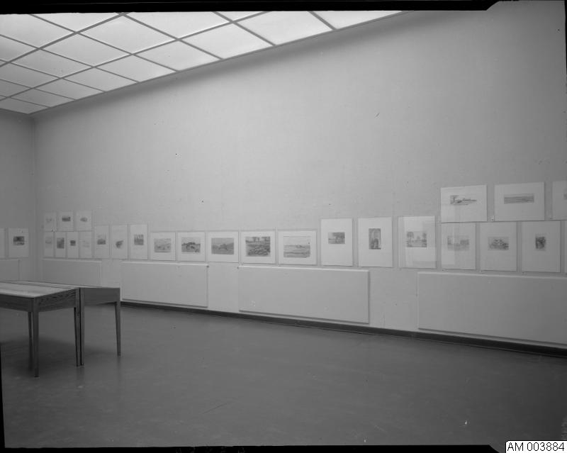 Inomhusbild som visar tillfälligt utställning av Hjalmar Asp. Teckningar och tryck. Montrar.