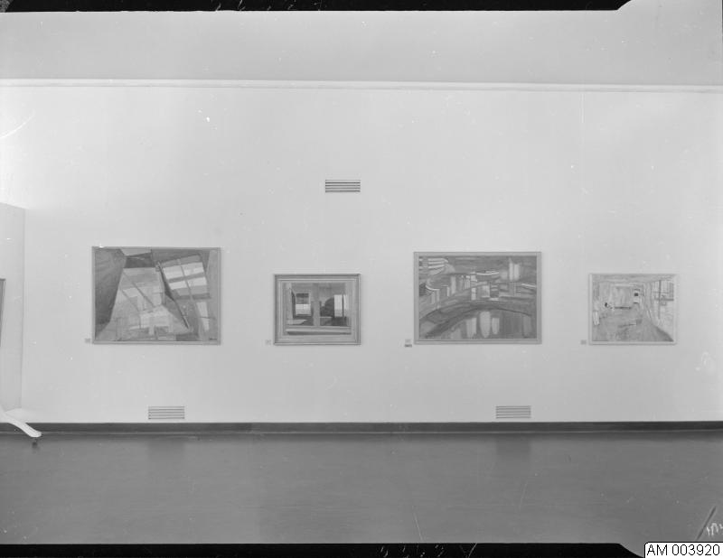 Inomhusbild som visar tillfällig utställning 28/11-15/12 1959. Målningar och teckningar av Tor Hörlin.