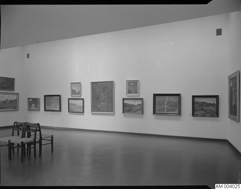 - Inomhusbild som visar Malmö museum tillfällig utställning Herman Österlund. Vt. 1958. Tavlor och stolar.