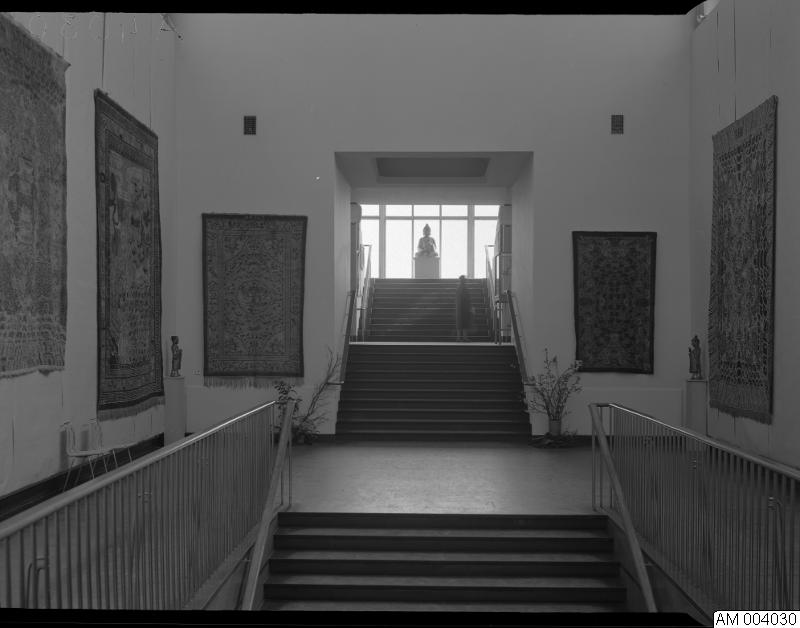 - Inomhusbild som visar malmö museum, tillfällig utställning. Vt. 1960 Nils Nessims samling. Mattor, statyer och stolar vid en trappa.
